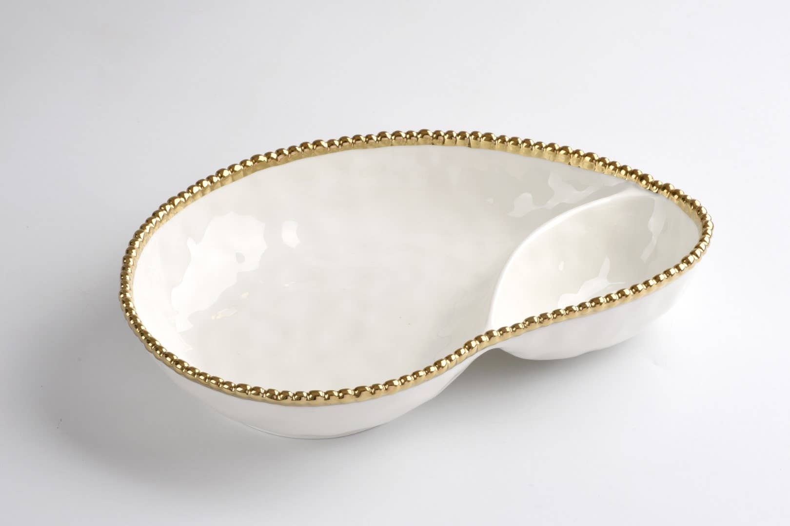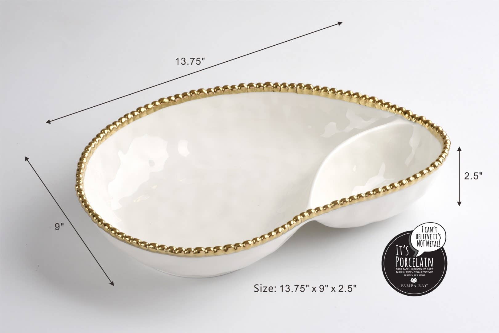 2 Section Serving Piece from our Golden Salerno Collection. Use for crudité and dressing, chips and dip or berries and cream (or chocolate!). High-fired white porcelain with stunning gold beads in titanium. Food safe, dishwasher safe, oven safe, Tarnish and stain-free. Easy Care.
