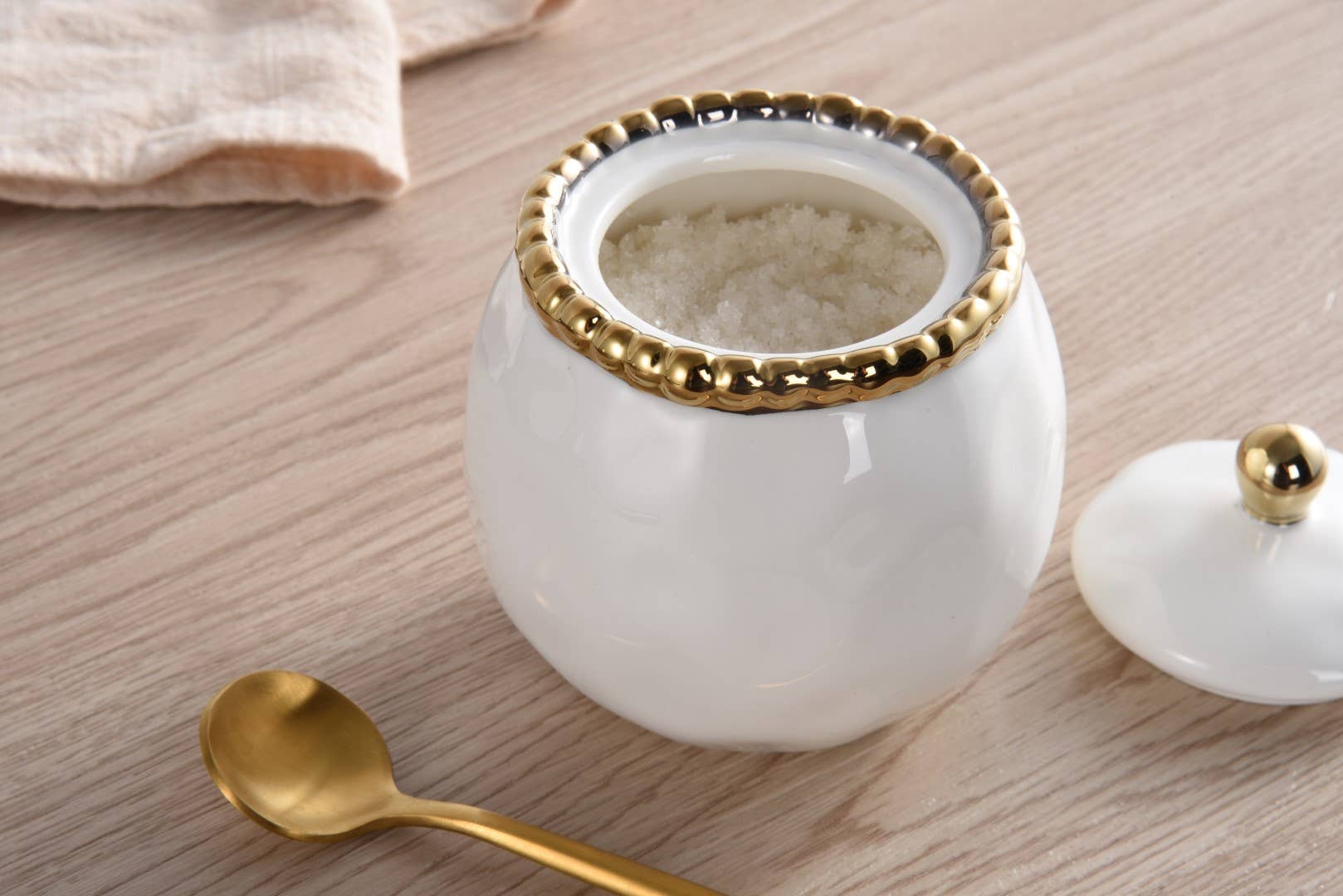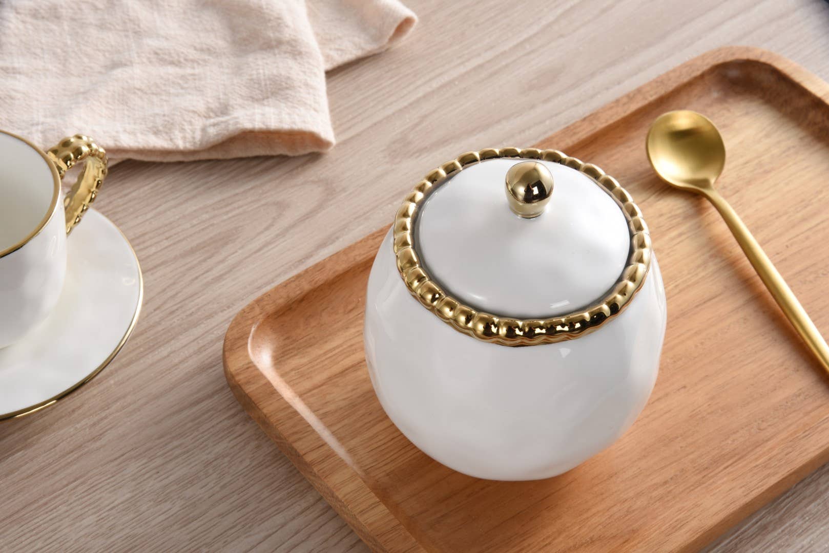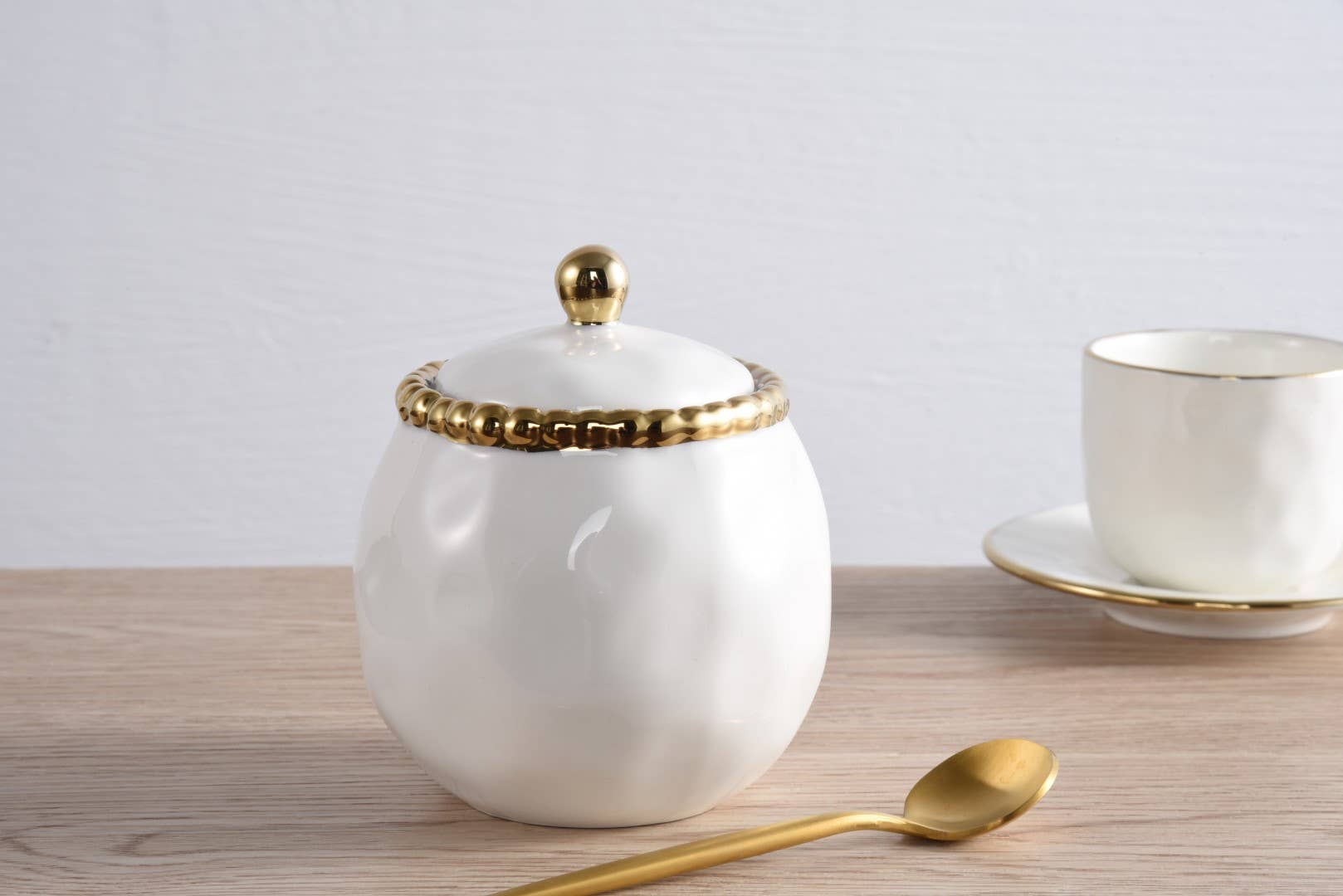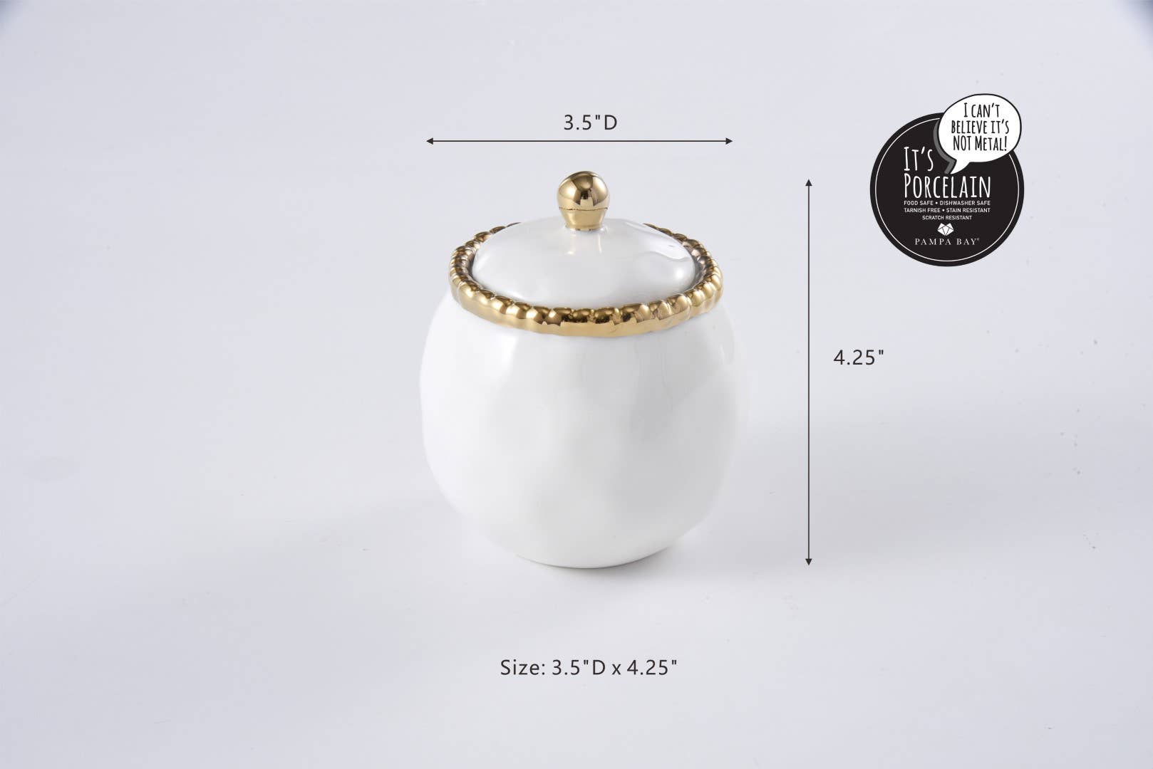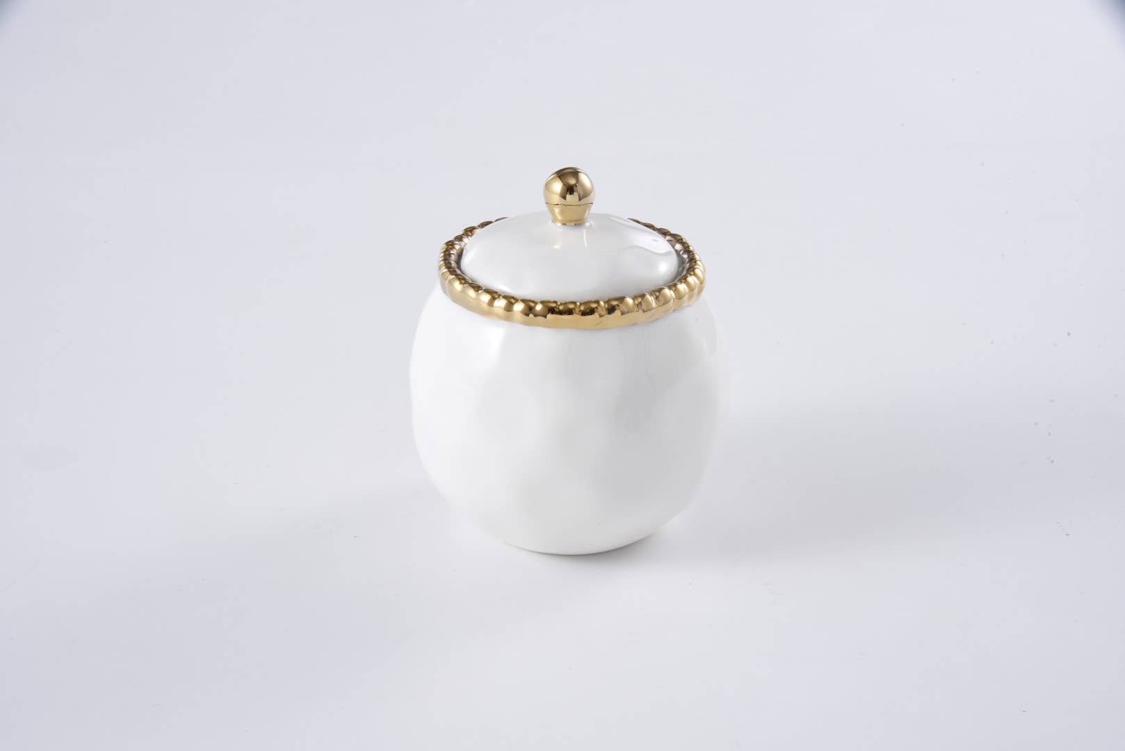 Covered Sugar Bowl from our Golden Salerno Collection. The perfect everyday sugar bowl is designed for relaxed meals with friends and family. Works equally well with jam, honey, mustard, and other condiments. Or keep this gorgeous bowl on your shelf, vanity, or bathroom counter to hold everything from cotton balls to buttons to earrings! Gorgeous white porcelain with beaded gold trim. Food safe, dishwasher safe, oven safe to 550°. Easy Care.