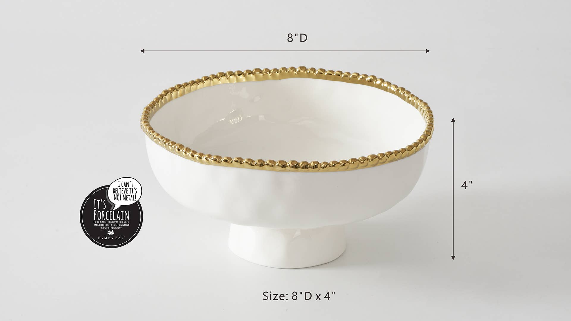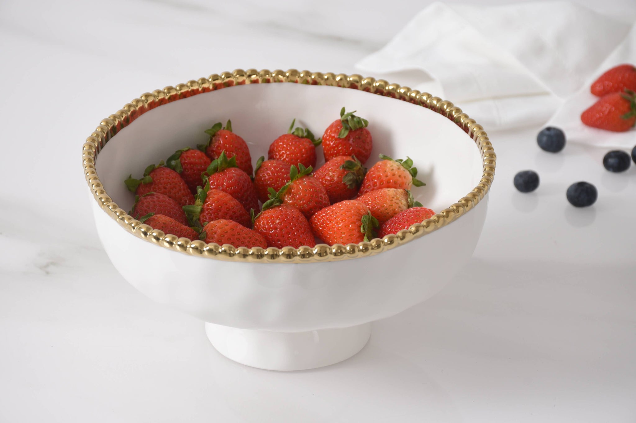 Medium Footed Bowl from our Golden Salerno Collection. Elevate your fruit or use as a centerpiece. Striking and elegant gold titanium beading with high-fired white porcelain. Food safe. Dishwasher safe. Oven safe to 500°. Easy Care.