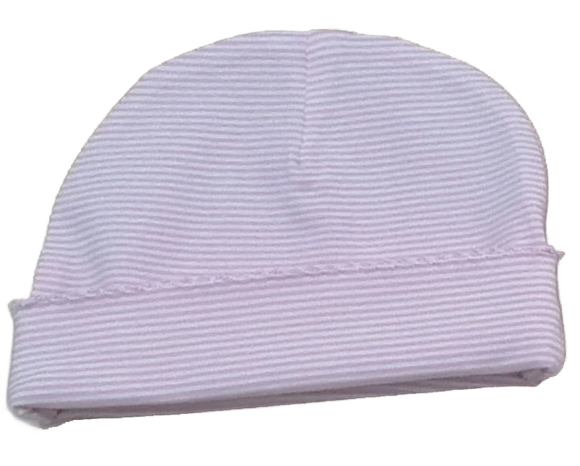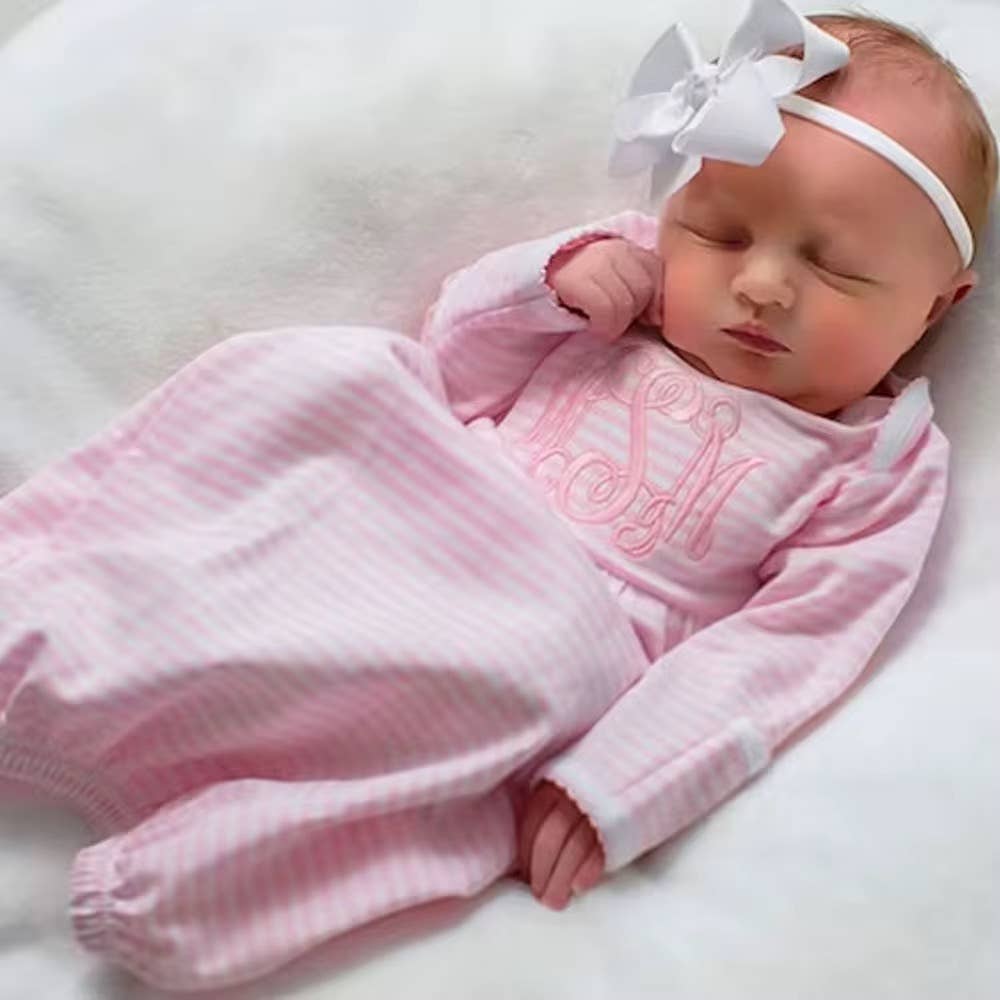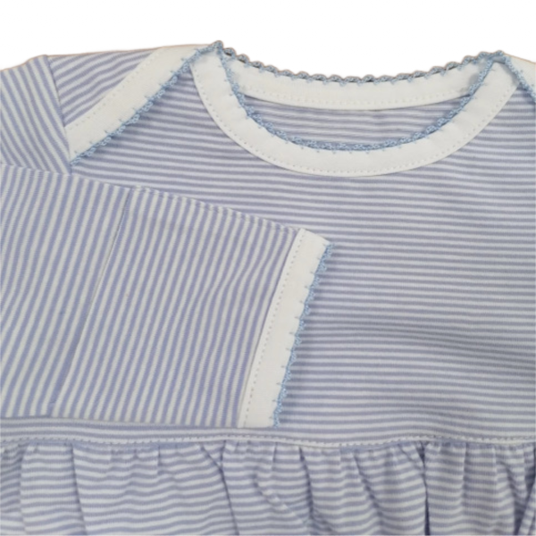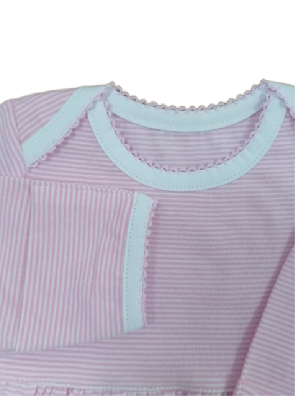 , finely-striped Pink or Blue on White fabric, featuring long sleeves and gathered elastic at the bottom for secure coverage. This classic style serves both comfort and practicality for babies, keeping them warm and making dressing simple. The gown's gently color and timeless design highlight its suitability for everyday use, while also carrying heirloom qualities as made with cotton and quality craftsmanship.