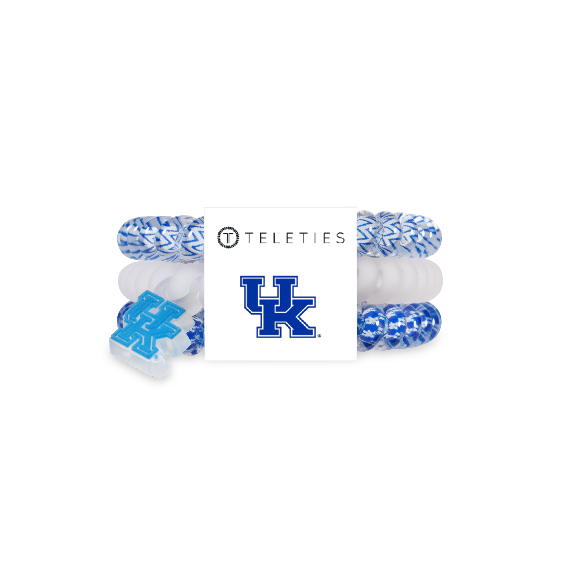 Cheer on the University of Kentucky in style with the TELETIES, Go Big Blue! Small Hair Ties in White and Blue offer a strong grip without damage, doubling as a chic wrist accessory when not in use. Your new favorite hair essentials all year round. Shop your favorite University of Kentucky hair accessories now! Go Big Blue!